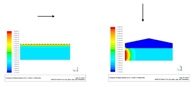 横行通风系统充氮过程,在60小时时各个面上的流动和氮气浓度都非常均匀,说明横向通风充氮工艺可以达到均匀充氮的目的。本研究为今后利用横向通风进行充氮气调提供了理论依据,有利于低氧充氮工艺的大面积推广,优化工艺流程,降低能耗,提高了氮气的利用率,最终提高经济效益。