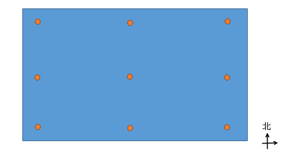 观测点数,本研究27个观测点,粮堆内部共三层观测点,最底层距离仓底1m,最上层距离粮面1m,中间层高度为粮堆高度的一半。图5为每层观测点布置示意图,每层9个观测点。每层(水平切面),北侧第一行距离通风管道1m,西侧第一列距离墙1m,左右对称,上下对称。