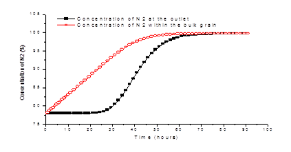 由图4可以看出,充氮气时间大约60h(2.5天), 出口氮气浓度可以达到98%,此时,粮堆内部氮气平均浓度99.5%。根据充氮储粮规范(仓内浓度达95%以上)要求,此时充氮过程可以结束。