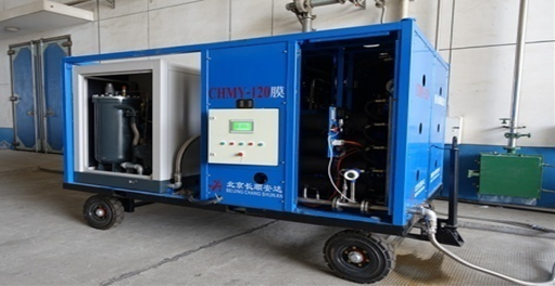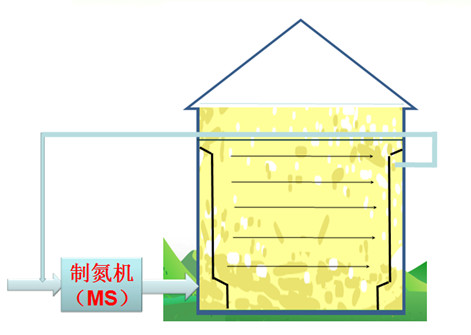 横向环流充氮气调技术属于储粮害虫富氮低氧绿色防治技术,该技术利用膜分离制氮机(MS),通过横向通风系统中的环流管网,将粮堆内可空气分离纯化为高浓度氮气,实现较低能耗的提高粮堆内的氮气浓度,用于储粮害虫绿色防治,可替代磷化氢等化学药剂的使用。