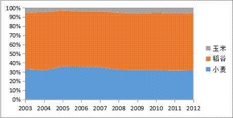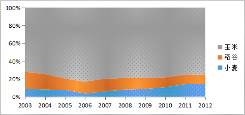 变动为2012年的14.1%、10.2% 和75.7%。按照这一变动趋势,我们预测到2020年我国三大主粮饲料消费中,小麦、稻谷和玉米所占比重将分别为16.4% 、5.8%和77.8%。