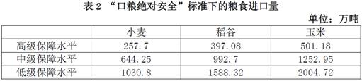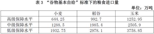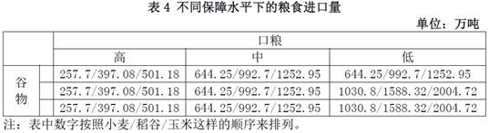 需要强调的是,要同时满足一定保障水平下的“谷物基本自给”和“口粮绝对安全”,为了确保至少其中一项目标能够实现,我们将取进口数量较低的某一品种的主粮进口量作为该保障水平下的进口数量。
