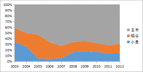 从图3可以看出,我国饲料消费中,小麦的比重上升显著,玉米小幅上升,稻谷明显下降。我国饲料消费中小麦、稻谷和玉米所占的比重分别由2003年的9.0%、19.0%和72.1%