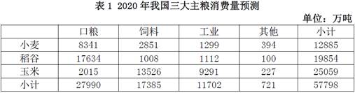 首先,我们根据2020年我国三大主粮中口粮、饲料、工业和其他消费量预测数值和各类用途下的三大主粮所占比重,预测出2020年我国小麦、稻谷和玉米的消费量。预测具体结果见表1。