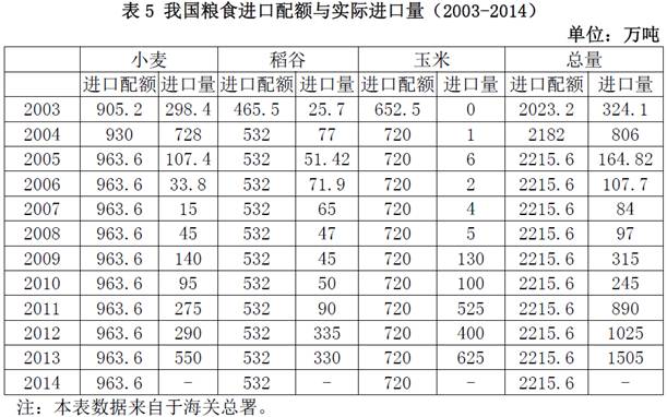 将计算出来的不同保障水平下我国粮食分品种进口数量与我国历年的分品种粮食进口配额(见表5)相对照,我们可以看出:在最高粮食保障水平下,现有的粮食进口配额能够支撑这一水平,尤其是小麦的进口配额有较大的富余量;在中等保障水平下,现有的小麦进口配额仍能满足这一水平的粮食进口要求,但稻谷和玉米的进口配额将分别会有460万吨和533万吨的缺口;在低等保障水平下,小麦、稻谷和玉米的进口配额均不能满足这一水平的粮食进口要求,配额缺口将分别为67万吨、1056万吨和1284万吨。