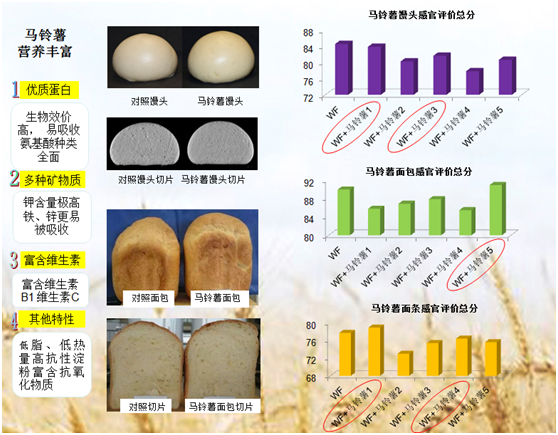添加马铃薯能够改善主食品的风味,提升了面条的爽滑性,增加了馒头和面包的体积,成本低。