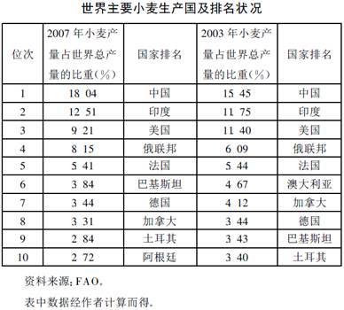 受2007小麦价格高涨的影响,2008年世界小麦种植面积扩大,产量68239.9万吨,较2007年增加近7000万吨。同时,世界小麦生产格局进一步变化。世界前十位小麦生产国产量占世界小麦总产量的69%以上。2003~2007年间,世界前五位小麦生产国(中国、印度、美国、俄联邦1.法国)小麦生产量占世界小麦总产量比重由2003年的50.1%上升到2007年的53.3%;其中我国小麦的比重由15.5%上升到18%;印度小麦的比重由11.8%上升到12.5%;俄联邦小麦的比重有6.1%上升到8.2%;而美国小麦的比重由11.4%下降到9.2%,法国小麦的比重变化不大(均在5.4%左右),详见下表。