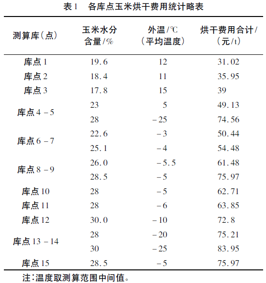 烘干费用主要包括烘干燃料费、电费、人工费,烘干机械折旧费。其中燃料费包括煤炭费、装卸车辆燃油费等,人工费包括装车入塔人工费、烘干人工费、烘后装车清理及入库人工费等。按照烘干费用的构成和作业流程,吉林省粮食局和中储粮吉林省分公司对吉林省的15个库点进行了测试,具体情况见表1。