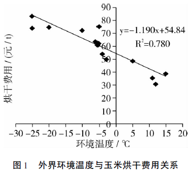 影响烘干费用的主要因素有:煤炭及燃料费用、烘干作业环境温度、烘干塔能耗及产能差异以及人员工资水平差异等。根据本研究建立的玉米烘干费用回归方程模型分析结果表明,烘干费用与外界温度呈现明显的负相关性,当外界环境温度每下降1℃,烘干费用增加近0.4元;烘干费用与玉米水分含量呈现明显的正相关性,当玉米水分含量增加1个百分点,烘干费用增加2.8元。利用此模型可以预测收获玉米的烘干费用,为收购企业在玉米收购过程中烘干费用计算提供依据,同时也可为国家烘干费用补贴政策提供参考。