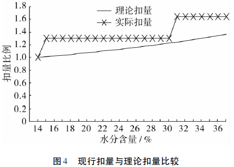 在实际工作中,为了保护农民利益,吉林省2012年玉米收购扣水扣量标准由过去的1:2的扣除比例降低为:水分在30%以内的采用1:1.3的扣量比例进行扣除,对于水分含量超过30%以上的,采用1:1.65的扣量比例进行扣除。但是,可以看出,这一降低后的扣除比例标准与理论的扣除量还是有一定的差距。即当农民交售粮食的水分含量越接近扣除水分含量的上限时,理论扣除量与实际扣除量越接近,如水分含量在30%时,1:1.3的扣除比例接近理论扣除比例1:1.23(这个比例没有考虑杂质的损耗),具体情况见图4。