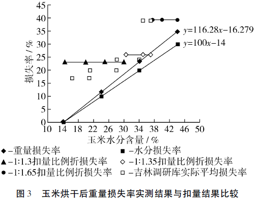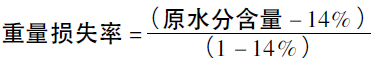 以100g玉米为例,水分从15%降到14%,蒸发量(减少了)为1.16g重量,那么蒸发量占玉米重量的百分比为1.16%。说明降1%的水分,实际重量减少1.16%,差额为0.16%。当玉米自然水分含量由30%降到14%时,减量18.6g,扣量比例应为1:1.23;当玉米自然水分含量由40%降到14%时,减量30g,扣量比例应为1:1.43。因此,理论上,随着水分的增加,重量损失也进一步加大。然而在实际的降水过程中,还存在杂质、无机物质等的损耗,这使得一定数量的高水分玉米降水前后的重量差异较理论值要高。