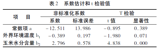 为综合研究玉米烘干费用和环境温度、玉米水分含量之间的关系,以外界环境温度(T)和玉米水分含量(M)为自变量,烘干费用(C)为因变量,建立二元线性回归模型,即:C=a+b1T+b2M,其中a为常数项,b1和b2为代估参数。