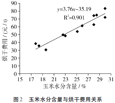 当玉米水分含量超过30%时,须经两次烘干处理,烘干费用则更高。根据对延边州某库的二次烘干实时监测数据显示,当水分每增加5个百分点时,每吨玉米烘干需要的煤电费用增加7.5元。