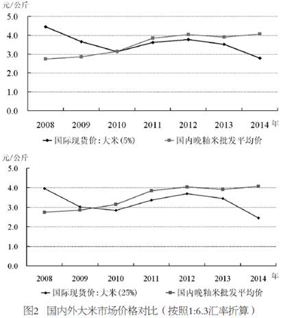 从稻谷国际市场来看,国际米价(25%碎米率)从2008年每吨601美元降到2014年每吨372美元,平均每吨降低了229美元,降幅约38%,10%碎米率的米价则更低,降低到每吨260美元。而同期国内晚籼米价格从每吨2750元上涨至4070元,平均每吨增加了1320元,增幅近50%。国际市场米价和国内米价呈现明显的交叉型,在2008年国际市场价格高于国内市场价格,2010年左右国际市场与国内价格基本一致,之后呈现剪刀差扩大态势(见图2)。按照美元兑换人民币1:6.3的汇率计算,当前我国大米市场价格高出国际市场价格1.7倍。如果考虑到人民币汇率升值,则国内外大米价差更大。在巨大的价格差诱导下,大米进口激增,走私加剧。