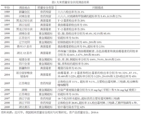 受极端气候和资源环境影响,稻米质量安全问题引发广泛关注。根据有关资料显示,在20世纪90年代中期之前,大米质量安全威胁主要来自农药残留。进入新世纪以来,大米质量安全问题频发。检测出的大米质量安全既有农药残留也有重金属超标问题。在一些地方,重金属超标、真菌毒素、农药残留等事故多次发生(见表1)。