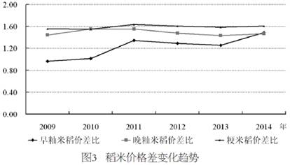 从国内稻米价格来看,随着国内稻谷最低收购价政策的实施和执行,国内稻谷价格稳步上升态势,呈现“稻强米弱”的格局。以中晚籼稻为例,其最低收购价由2004年每吨1440元,增加到2014年的2760元,累计增加了1320元,增幅达92%。受最低收购价托市,晚籼稻的市场价格随之上升。而同期晚籼米价格上涨速度相对较小,导致稻谷和大米价格差异缩小(见图3)。从图中可以看出,晚籼米稻、粳米稻价差比2010年~2014年间呈现逐步缩小态势,特别是晚籼米稻价格差呈现明显下降态势。如果考虑到稻米加工成本的上升,则稻米价格扭曲更为严重。此外,从当前国内不同品种稻米关系看出,粳米稻的价差基本稳定,早籼米稻价差趋于上升,其价格基本与晚籼米同价。而从早籼米和晚籼米的食用性评价看,早籼米和晚籼米的价差关系存在明显扭曲,也反映出稻谷价格和米价的不合理性。