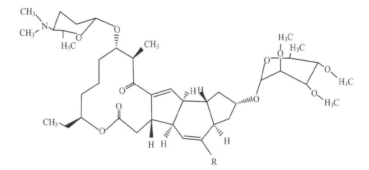 多杀菌素(spinosad)是放线菌刺糖多孢菌Saccharopolyspora spinosa有氧发酵的胞内次级代谢产物,其活性成分为多杀菌素A和多杀菌素D,均属于大环内酯类化合物。多杀菌素包含1个独特的四环结构,左右两端分别连接着福乐胺糖和鼠李糖,其结构式如图。